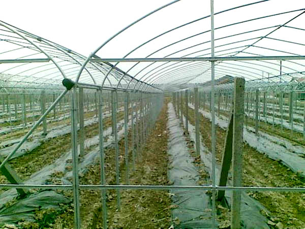 ⑵规格。棚宽4-6米,长30-50米,高1.6-2米。建立大棚群时,应使棚间距达到1.2-1.5米,棚头距离4-5米,有利运输和通风,避免遮荫。
